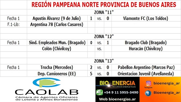 Torneo Regional Federal Amateur: Región Pampeana Norte Resultados de la Fecha 1 de la Zona 11 a la 13